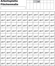 | Die drei Arbeitsplatten sind in verschiedenen Teilungen jeweils mit einem Quadratdezimeter bedruckt. Die entsprechenden Maßeinheiten sind ebenfalls in dieser dm2-Fläche eingedruckt (ausgenommen mm2), zusätzlich auch in der Stellenwerttafel oberhalb. | |||||||||||||||||||||||||